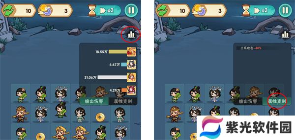 3、点击暂停下方的数据小图标,查看英雄输出和属性克制