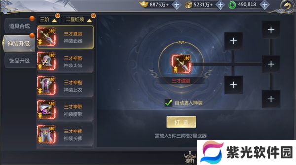 在锻造界面中,玩家可以升级装备,提升装备的星级。在神装升级中,具体要求如下: