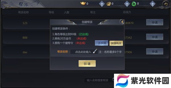 2、点击【帮派】界面中的【创建帮派】按钮,系统就会弹出创建帮派的提示窗口,当等级满足等级68级,拥有20万金币、以及【建帮令】道具等以上条件,输入名称后,即可成功创建帮派,成为帮主。