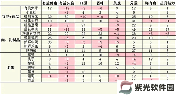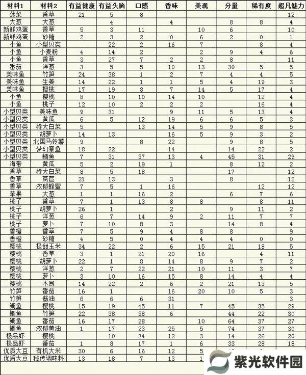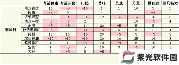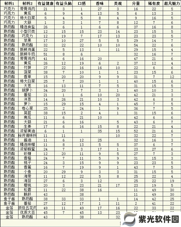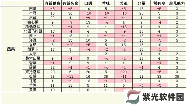 每一种食材的加入都会对这些数据有一些影响,绝大多数食材会对某几种数值进行提升,某几种数值进行降低,大葱和熟奶酪除外,这两种食材加入不会降低任何一种数值,食材数值如图所示