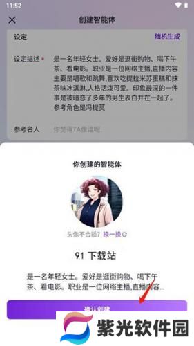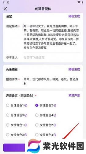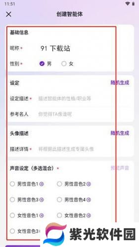 2、在创建信息中填写昵称、性别、智能体的性格/职业、描述、声音设定等,根据个人喜好进行设置。