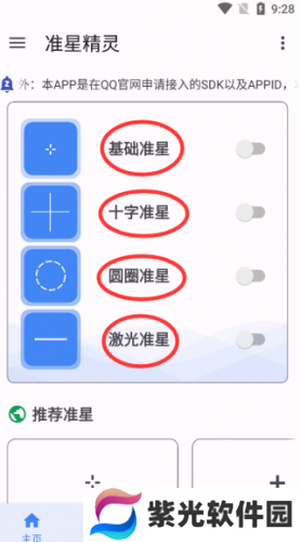 1、进入到软件的主页面,我们可以看到有很多准星类型,包括基础准星、十字准星、圆圈准星和激光准星,选择一个点后右侧按钮即可开启,