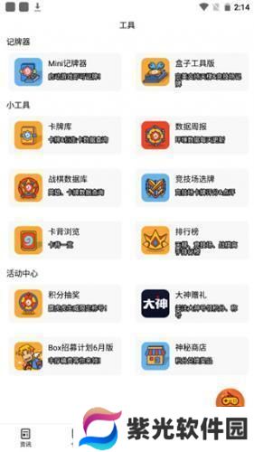 4、点击工具,它为用户提供了mini记牌器、盒子工具版、卡牌库、竞技场选牌等等工具;