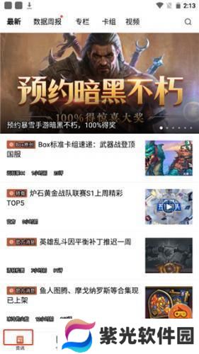 1、打开在本地下载的软件,进入首页资讯,为用户提供了搞笑视频、短平快的炉石资讯,当前热门的卡组攻略等等全面的资讯;