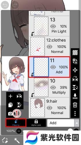 3、点击图层1使添加的图层成为当前图层。然后点击"添加"以打开步骤2的混合模式菜单。最后选择步骤3在 "混合" 菜单中添加。