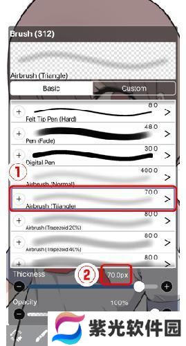 5、需要把颜色换成白色, 然后选择喷枪画笔,有点像三角形的画笔,选择70像素的厚度设置。