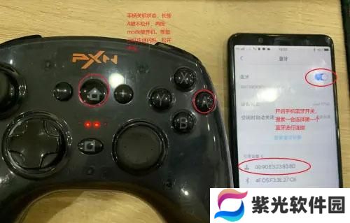 3、手柄关机状态,长按A键不松开,再按mode键,等指示灯快速闪烁立马松开手指。然后开启手机蓝牙开关,等待一会,选择搜索到的第一个蓝牙进行连接;