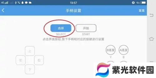 9、进入FC手柄设置,手指按触"选择",然后操作手柄上面的按键,把手柄的按键设置到游戏按键上,这时可以看到手柄设置界面的按键为蓝色涂满状态,表示设置成功。其他的按键一一对应设置好后,点击左上角返回自动保存;