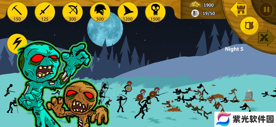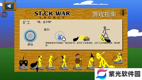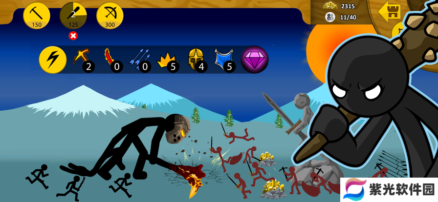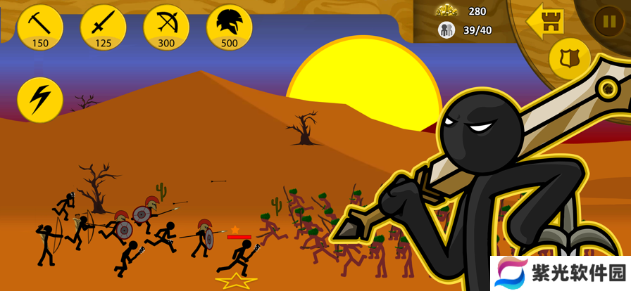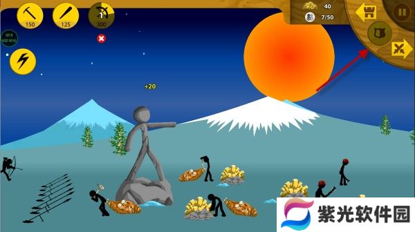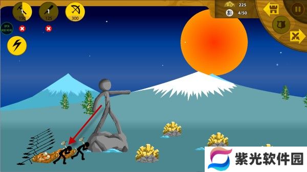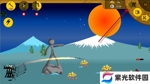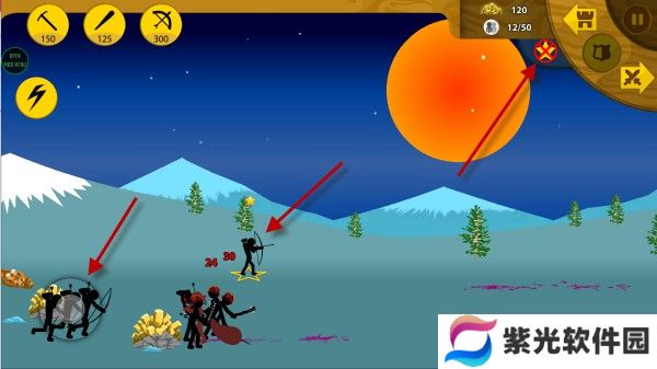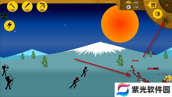 7、当然要是敌人来袭,还能选择防御模式,每一个矿工会停止挖矿,火柴人会回到自己一方组成防御。