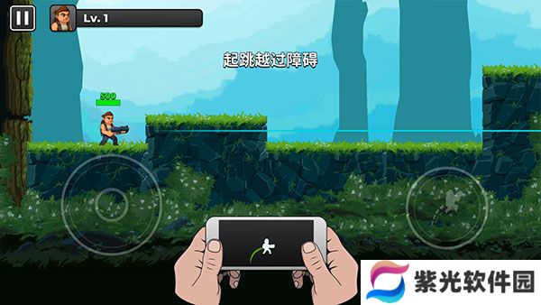 4、左手按住的同时点击右边屏幕起跳,跨越障碍。