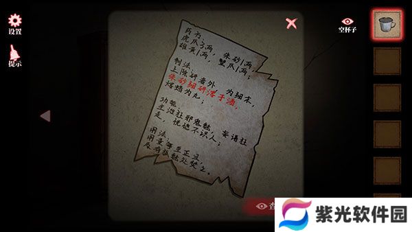 墙上的药方会告诉你需要将朱砂溶解于酒中,在房外你可以找到一坛酒,使用空杯子装酒来解决谜题。