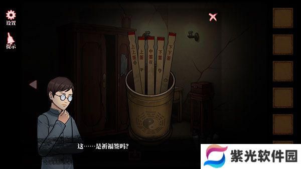 在柜子上有一个签盒,点击并摇晃签盒,会出现纸片。根据纸片上的信息,你将获得签盒中的五支签,上面会有关于匣子密码的线索。