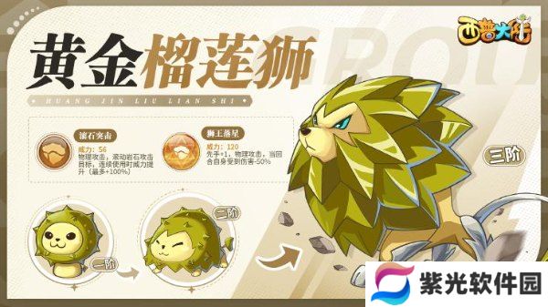 黄金榴莲狮小时候性格温和,喜欢将身体缩进外壳以保护自己,和泥球仔是最好的朋友。随着成长,它成为了榴莲狮群的王者,习惯高高站立,凝视远方,毛发反射出闪耀光芒,展现出无与伦比的王者气息。
