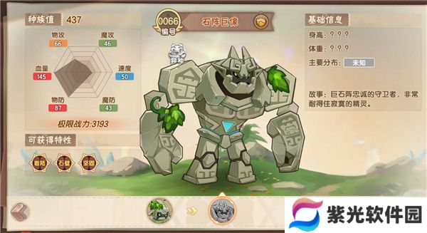 3、石阵巨像——没啥用(玩具),可能用于针对弱地高攻精灵,满血满物防种族值,小技能血量决定伤害,大招物防决定伤害。