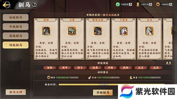 5、然后是马匹的获取方式:当主城等级达到9级并且解锁了马厩之后,就可以前往马厩,通过消耗基础资源驯马获得马匹。