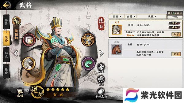 1、游戏中装备一共分为四种,它们分别是:**不见血的各种武器、刀枪不入的铠甲防具、日行千里的宝马良驹,还有烁烁放光的神秘宝物。玩家获取装备后可以前往武将详情中的装备页面为武将搭配装备。