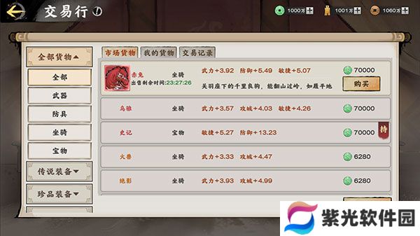 8、同时各位将军可能都遇到过这样一个问题,就是自己辛辛苦苦获得了很厉害的装备,但是和自己的武将并不是很适配。用吧,效果一般,不用吧,一直放着心里很不舒服。所以我们在游戏中加入了交易行功能,支持玩家自由交易,这样就不会再出现极品装备烂在手里也毫无用处的情况啦。