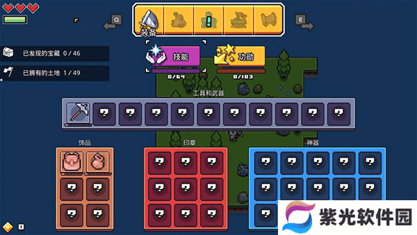 点击菜单栏中的“装备”按钮,可打开装备界面,此处将展示已经解锁的工具、武器、饰品、印章及神器