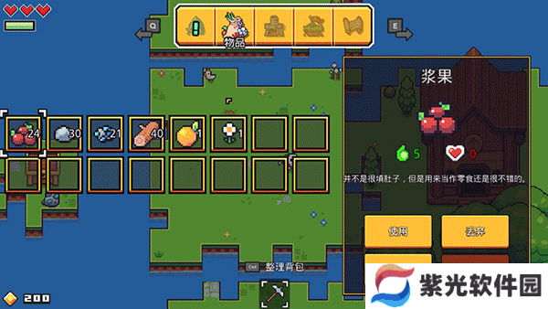 点击相应物品可查看详情,如:图示中的浆果下方的图标标明使用该物品后可恢复5点饥饿值和0点健康值