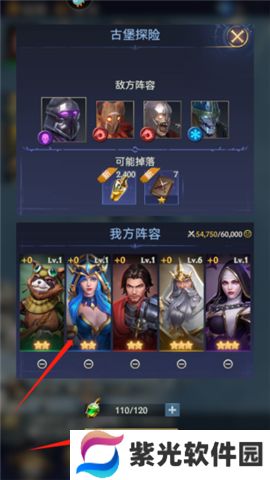 3、进入关卡前会有敌我阵容,以及可能掉落的奖励,使用能量瓶开启。