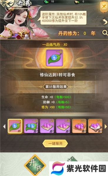 玩家一转开启丹药,玩家可通过食用丹药和美食提升玩家属性和对应的丹药修为和美食修为,当修为到达一定值还会获得特殊增益效果。