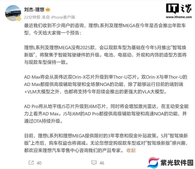除了产品升级信息外,刘杰还透露了关于购车政策的调整。目前,理想L系列及理想MEGA车型正提供限时3年0息贷款和现金补贴政策。然而,随着“智驾焕新版”的上市,这些购车权益将有所调整,消费者需密切关注理想汽车的官方公告。
