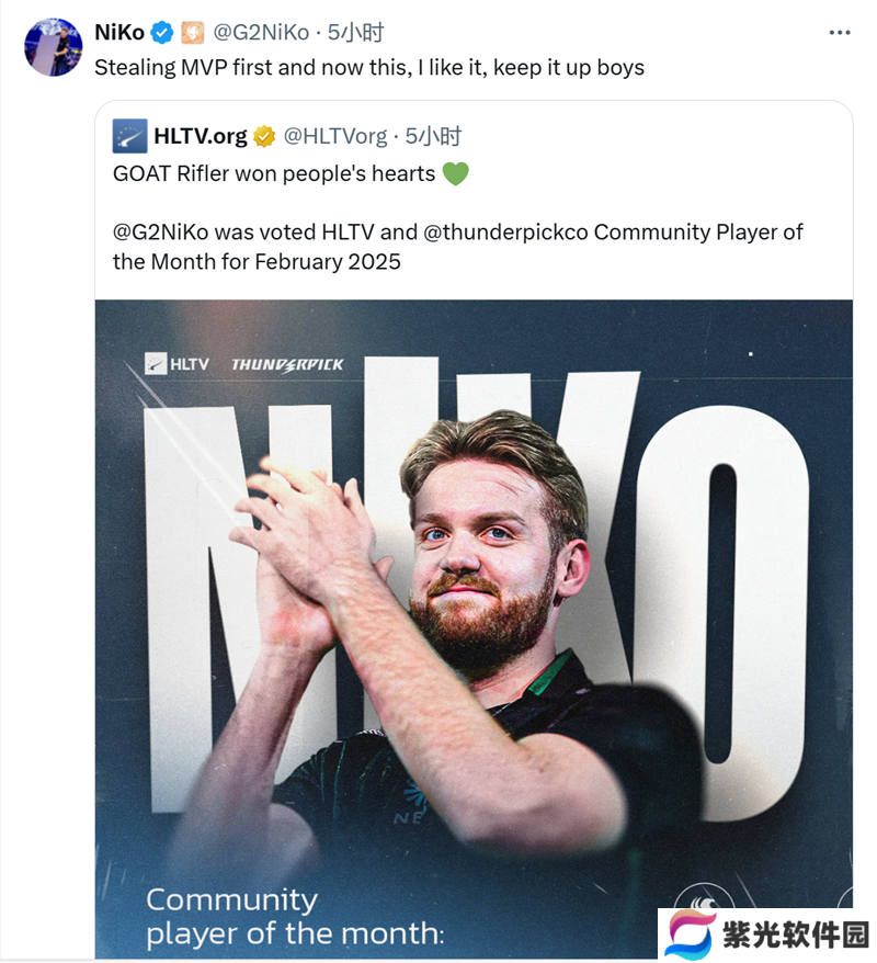 NiKo本人也转发推文并开玩笑说道:“先是偷走了MVP,现在又是这个,我喜欢,小伙子们继续保持。”