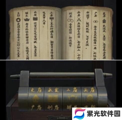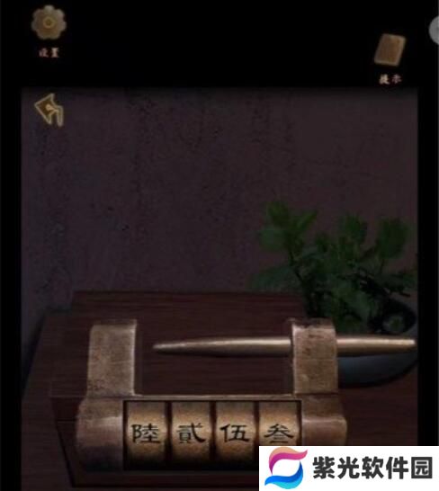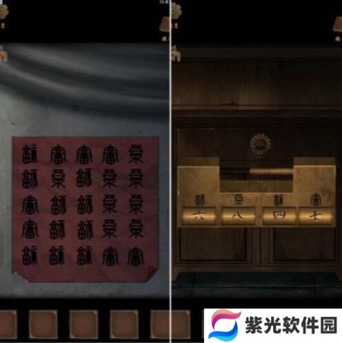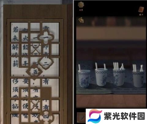 13、屏风后面结合挂字信息摆放桌前字画筒数量打开窗户得到抽屉拉环,安装在左边书柜抽屉上拉开得到印章,蓖麻油和朱砂粉倒入书桌上砚台,用印章得到蘸了印泥的印章,盖在字上得到铜钥匙,打开右边暗室。