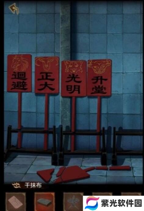 5、左边房间,左边位置得到水火棍,墙上信息摆放正大光明牌子得到小钥匙。