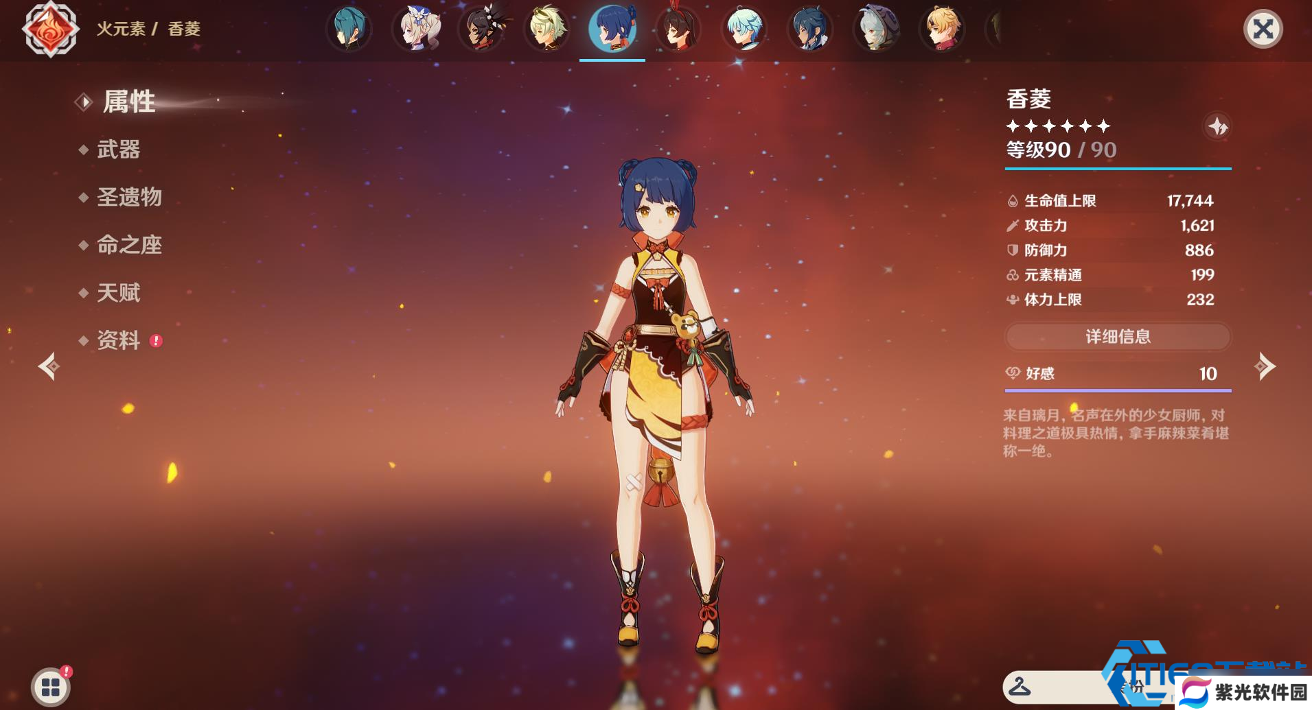 香菱的核心价值在于其元素爆发——旋火轮。该技能拥有“锁面板”机制(释放瞬间锁定当前属性),但自身充能效率极低,因此充能成为首要需求: