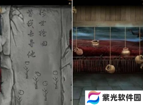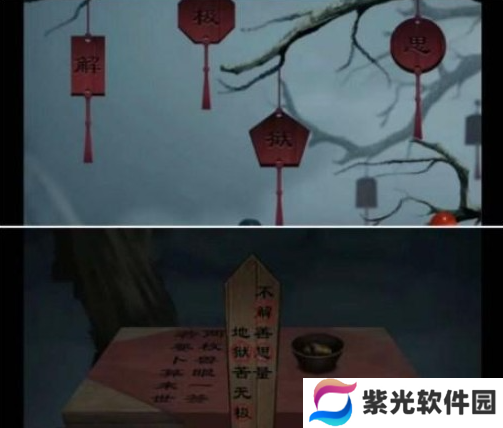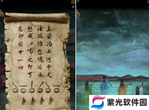 14.奈何桥边,依据枯树下边墓碑信息放置草屋上边挂着的瓶子获得汤柜锁匙,开启汤柜获得四碗泪,湖上发生四只鬼融合桌子信息获得孟婆汤次序为蓝黄白绿蓝黄,获得孟婆汤。