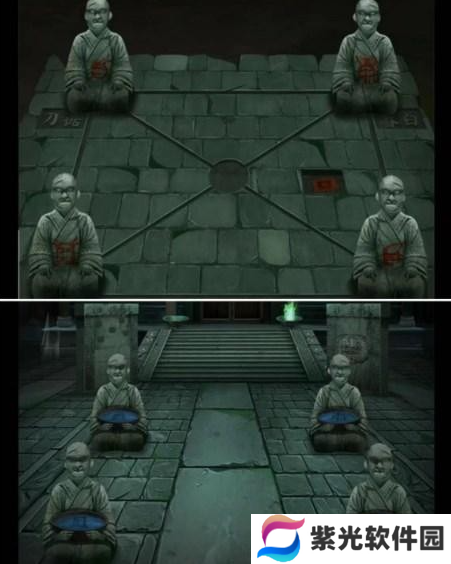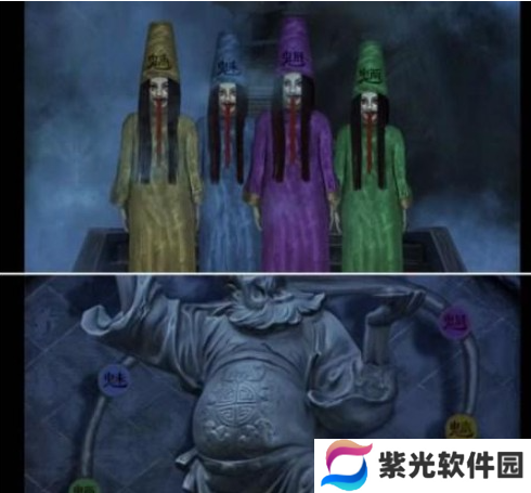 8.铜币锁匙开启供奉阁大门,莲花灯进行游戏获得阴火魂灯,左侧墙壁通告信息记牢,右侧柜台把阴火魂灯和纸元宝放入火盆获得柳树枝条,外出用柳枝引路,右侧通道发生小鬼挡路,回到大殿,钟馗后边四个字变颜色获得平鬼剑,外出砍小鬼,上来,树边上的石台完