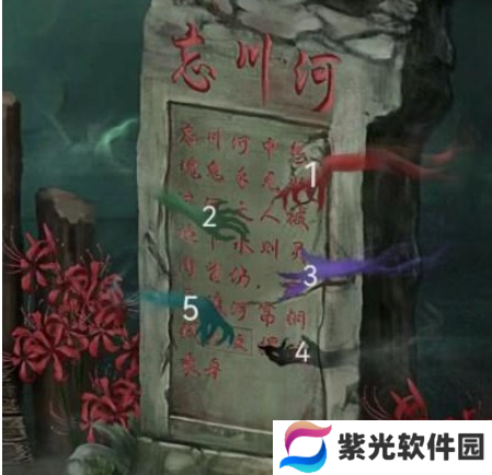 13.左侧花丛里获得飞挝,点击河中木盒应用飞挝进行小游戏获得三文钱,放入船夫拖盘,发生船点击获得红绿紫黑蓝次序,按序点击忘川河墓碑里的鬼手,获得三文钱,放入船夫拖盘,登船。