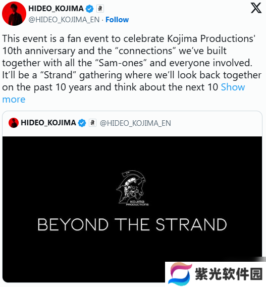 小岛在社交媒体发文称,"Beyond The Strand"是一场"庆祝小岛工作室成立十周年,以及我们与所有"山姆同僚"及相关伙伴建立"连接"的粉丝盛会"。他进一步表示:"这将是一场" Strand"主题的聚会,我们将共同回顾过去十年,展望未来十年"。活动公告提及"将包含特别嘉宾亮相并提供未来项目前瞻",外界普遍预期届时将披露小岛秀夫新作的相关信息。