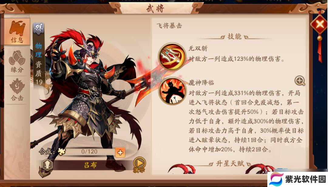 提到吕布,怎能不谈那抹如烈焰般奔腾的赤兔?它绝非仅仅是一匹快马,它是吕布化身为战场风暴的核心引擎!赤兔赋予吕布的,是压倒性的速度与无坚不摧的冲击力。想象一下:战斗伊始,吕布便如一道血色闪电,无视前方阻碍,瞬间撕裂敌方阵型,直插敌人心脏!这完美契合了吕布恐怖爆发的特性。